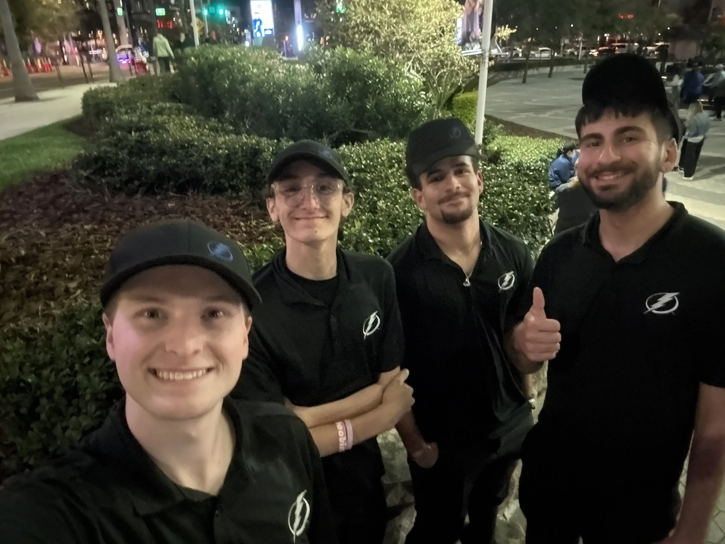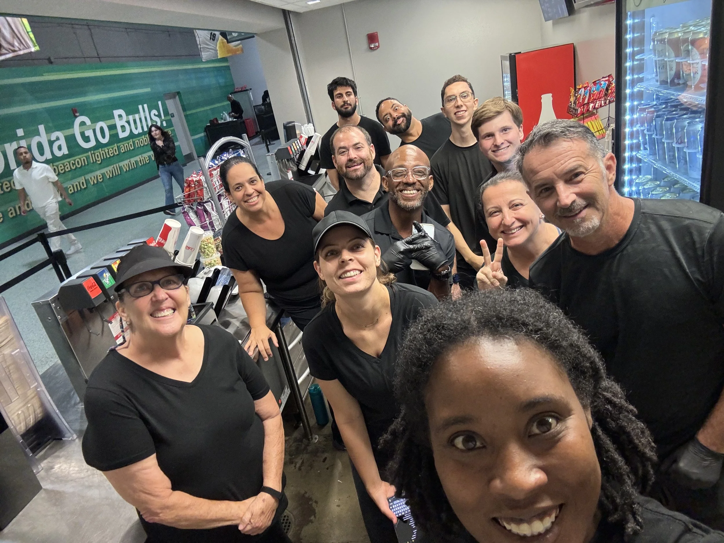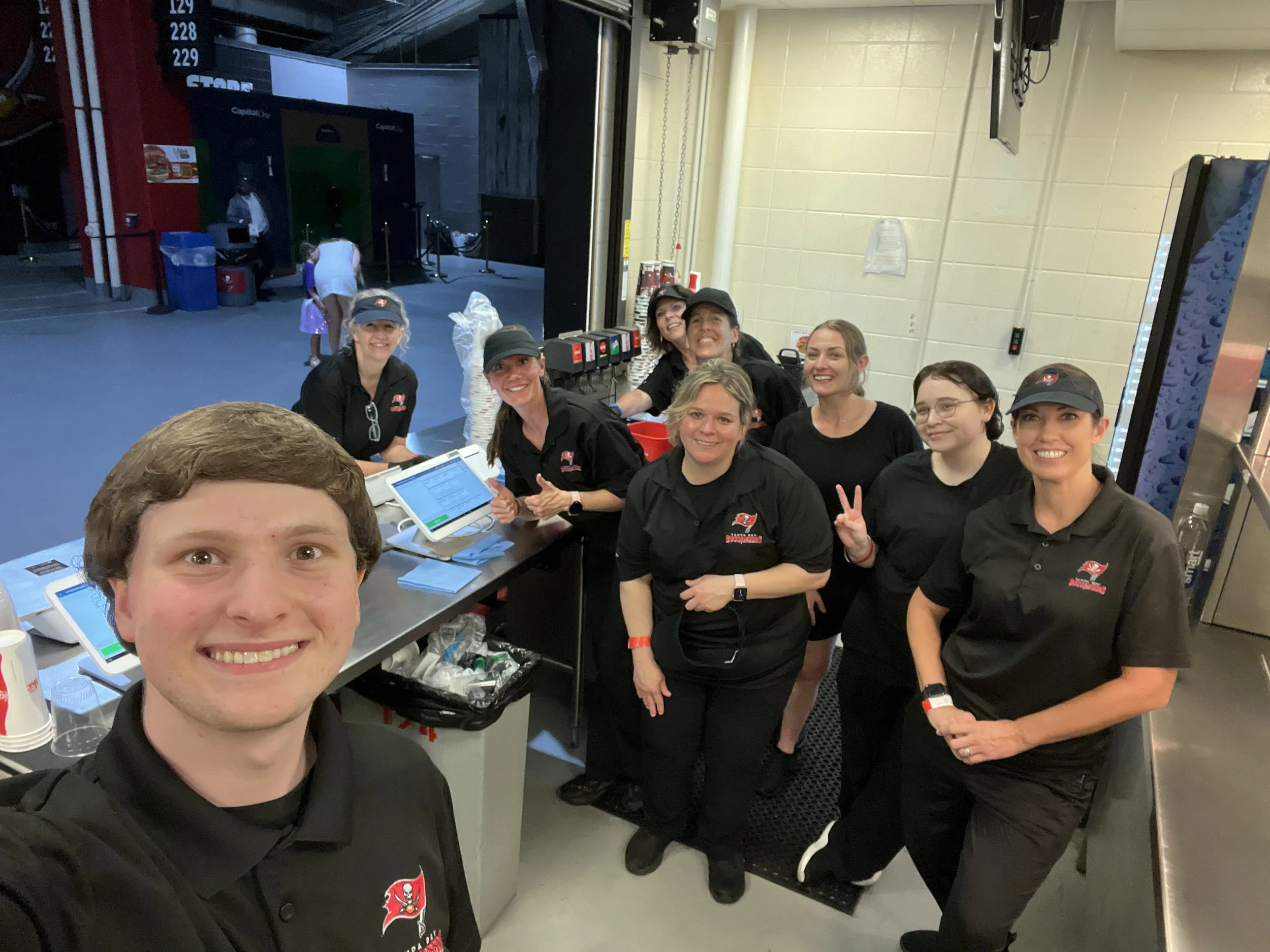 Group of eight smiling women and one man, all wearing black shirts and hats with a sports logo, posing for a selfie inside a stadium concession stand.