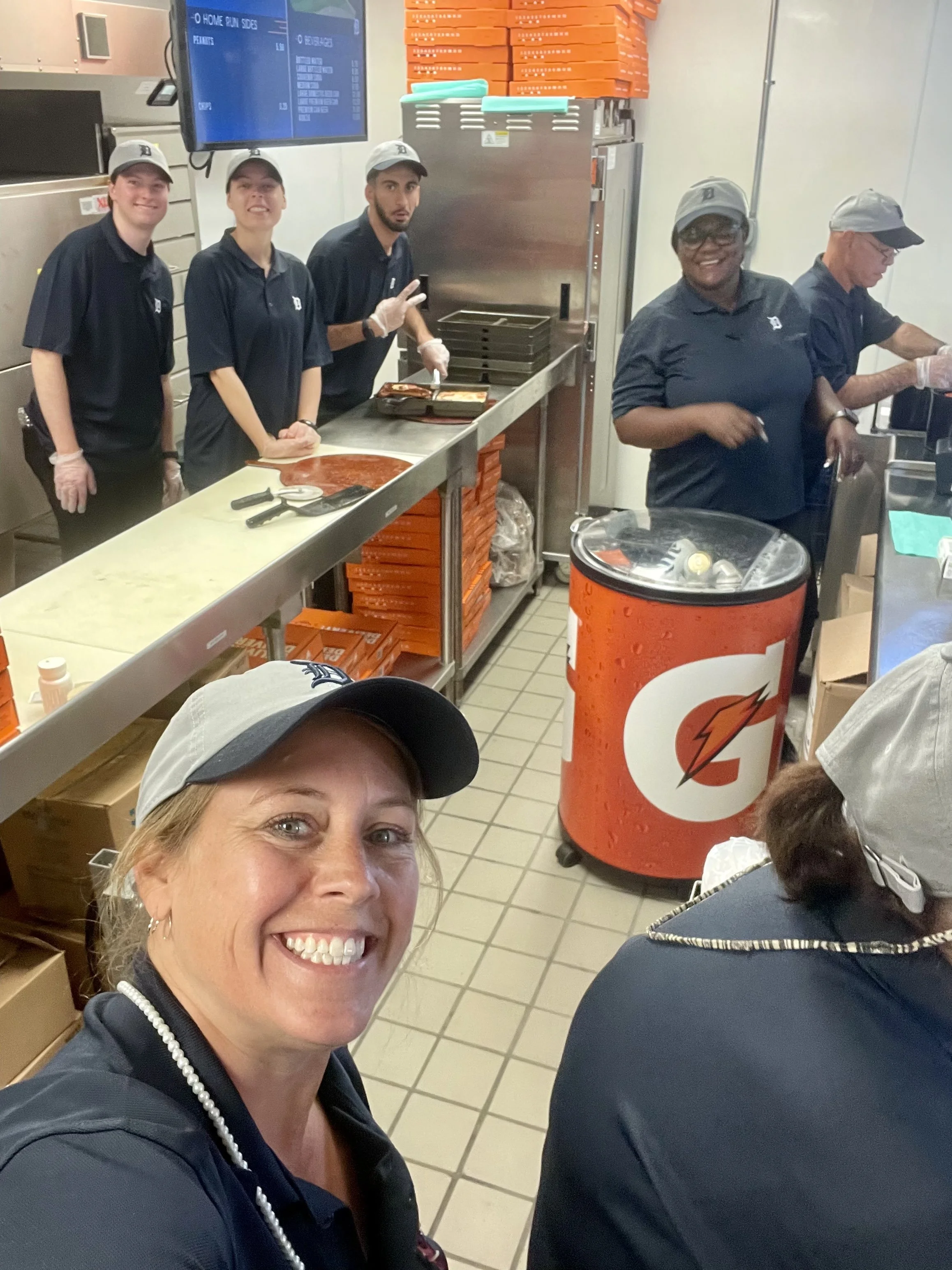 Group of five fast food workers in a kitchen, smiling at the camera. One woman in the foreground is taking a selfie, with a woman and three men in the background preparing food. The kitchen has orange pizza boxes, black trays, and a large Gatorade co